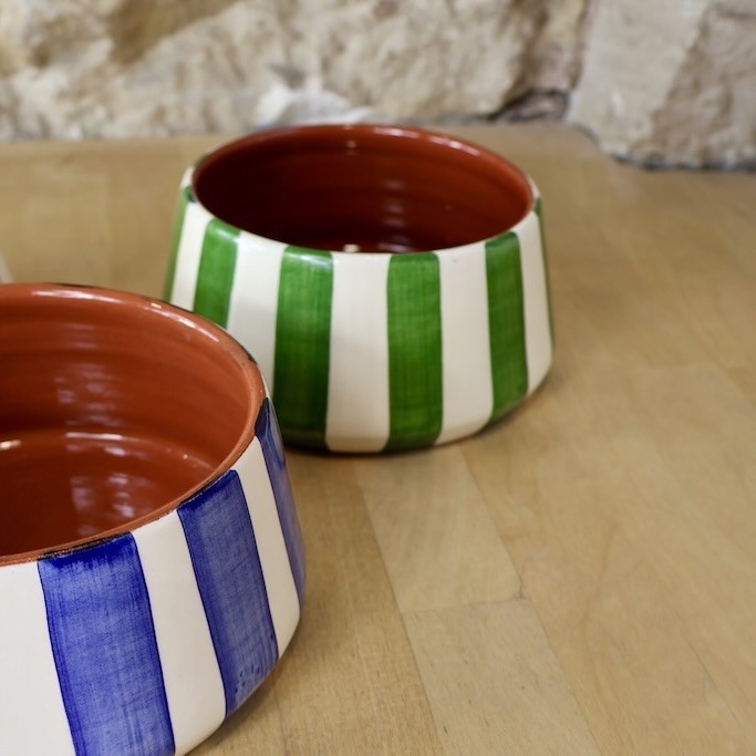Grand saladier bold rayé en terre cuite artisanale de Casa Cubista fabriqué et peint à la main au Portugal par des artisans potiers.