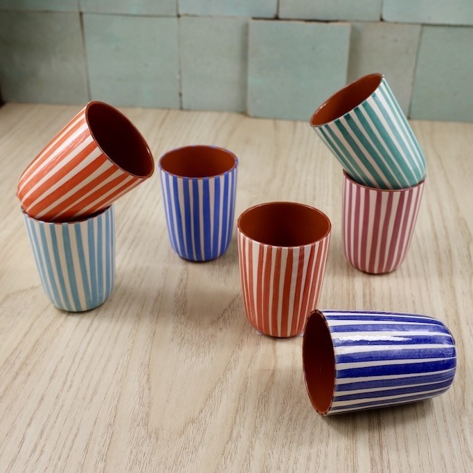 Tasse à café listas en terre cuite artisanale pour A loja da Cerâmica par Nelia Patalim fabriqué et peint à la main au Portugal par des artisans potiers.