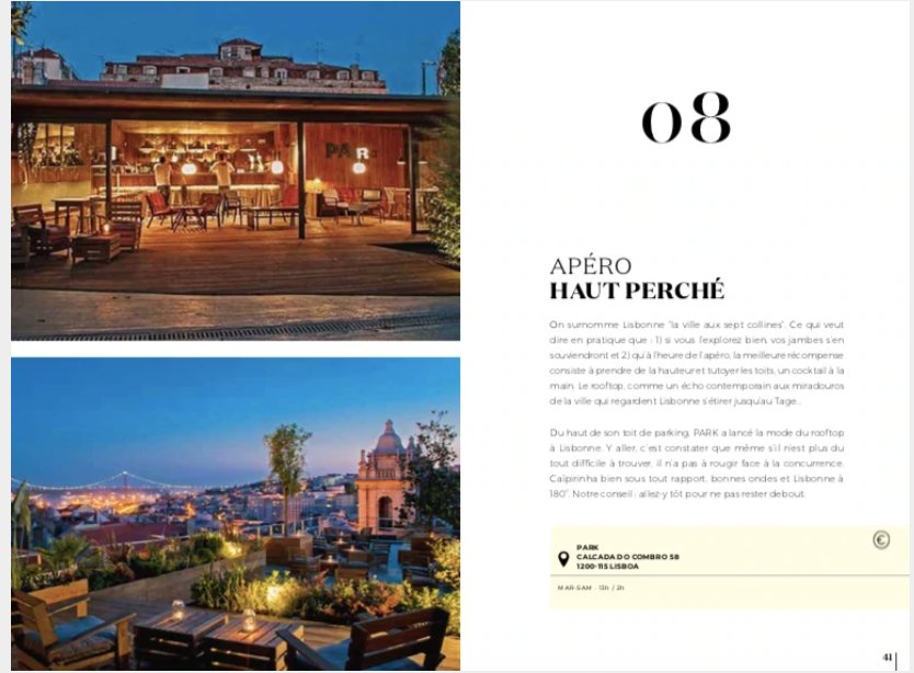 Boire un cocktail à remonter le temps, filer dans une librairie-dé à coudre, percer les secrets du bacalhau, courir avec les nuages, faire escale sous les tropiques, trouver le restaurant dont on ne vous dira pas l’adresse, trinquer avec un vieux de la vieille, réveiller son céramiste intérieur, se bagarrer avec une araignée de mer, infiltrer le repaire secret des chanteurs de fado, croquer dans un palmier taillé pour la postérité…