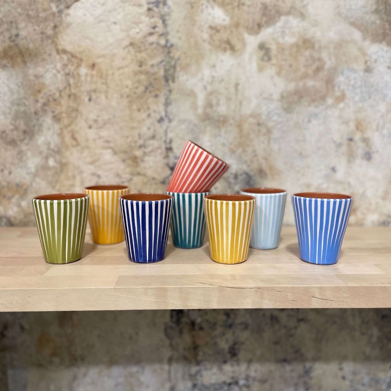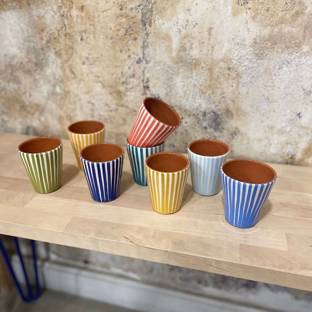 Tasse en V listas en terre cuite artisanale pour A loja da Cerâmica par Nelia Patalim fabriquée et peinte à la main au Portugal par des artisans potiers.