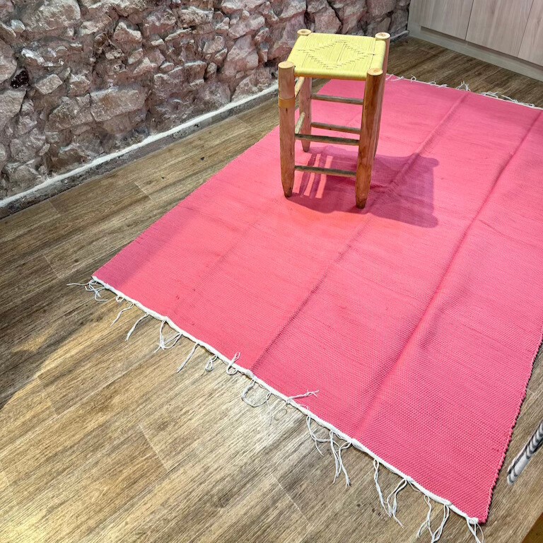 Ces tapis sont réalisés à partir de lirettes de coton – de fines bandes de tissu issues des surplus de l’industrie textile – soigneusement assemblées pour créer un motif unique à chaque pièce. Chaque Tapis Trapos est donc une pièce originale, avec des variations de couleurs qui reflètent à la fois la créativité et les ressources disponibles à l’atelier.