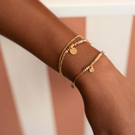 Bracelet en chaîne serpent avec des perles à facettes et un pendentif mini soleil.