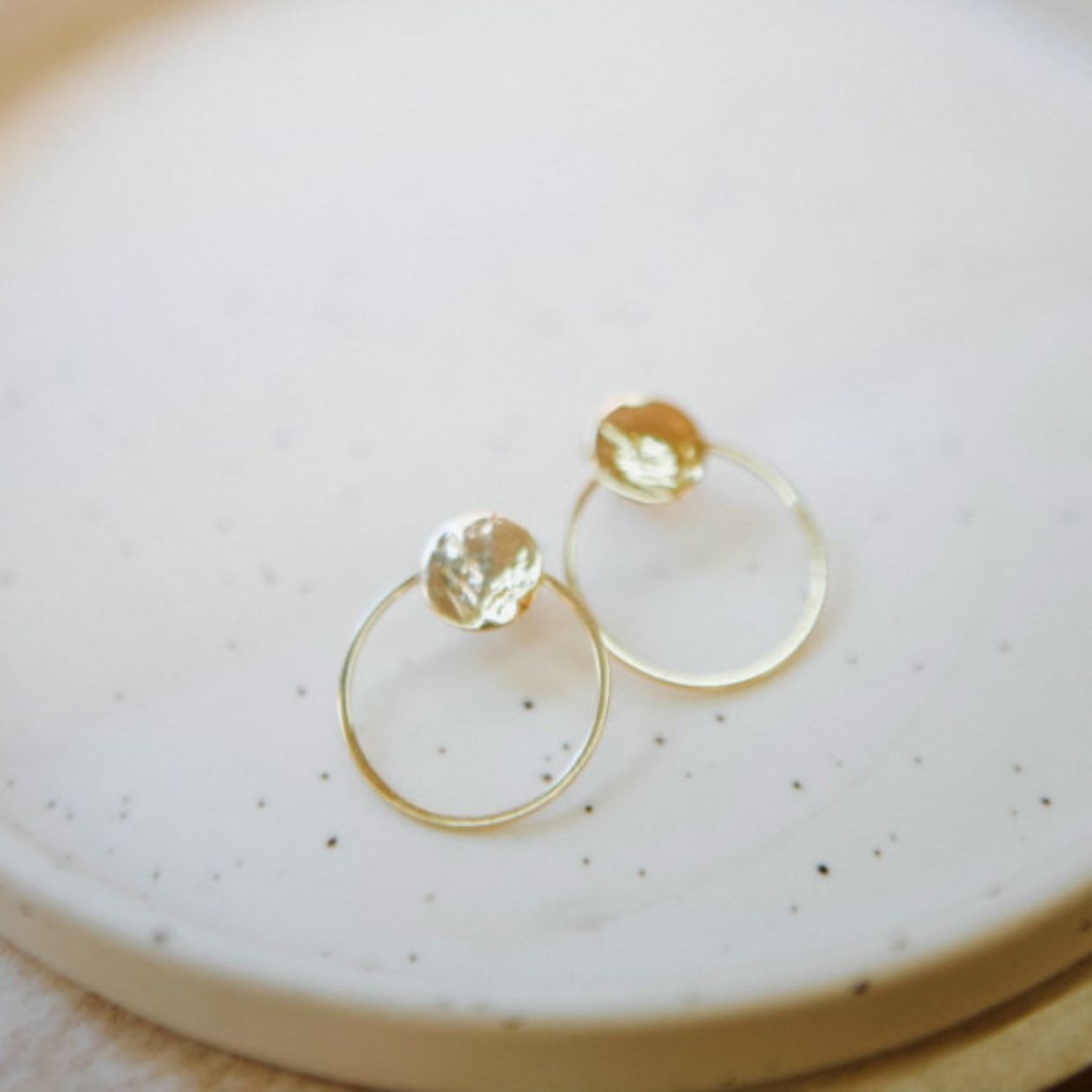 La gracieuse imparfaite est une paire dorée à l’or fin, le clou martelé apporte de l’originalité à cette paire de boules d’oreilles.