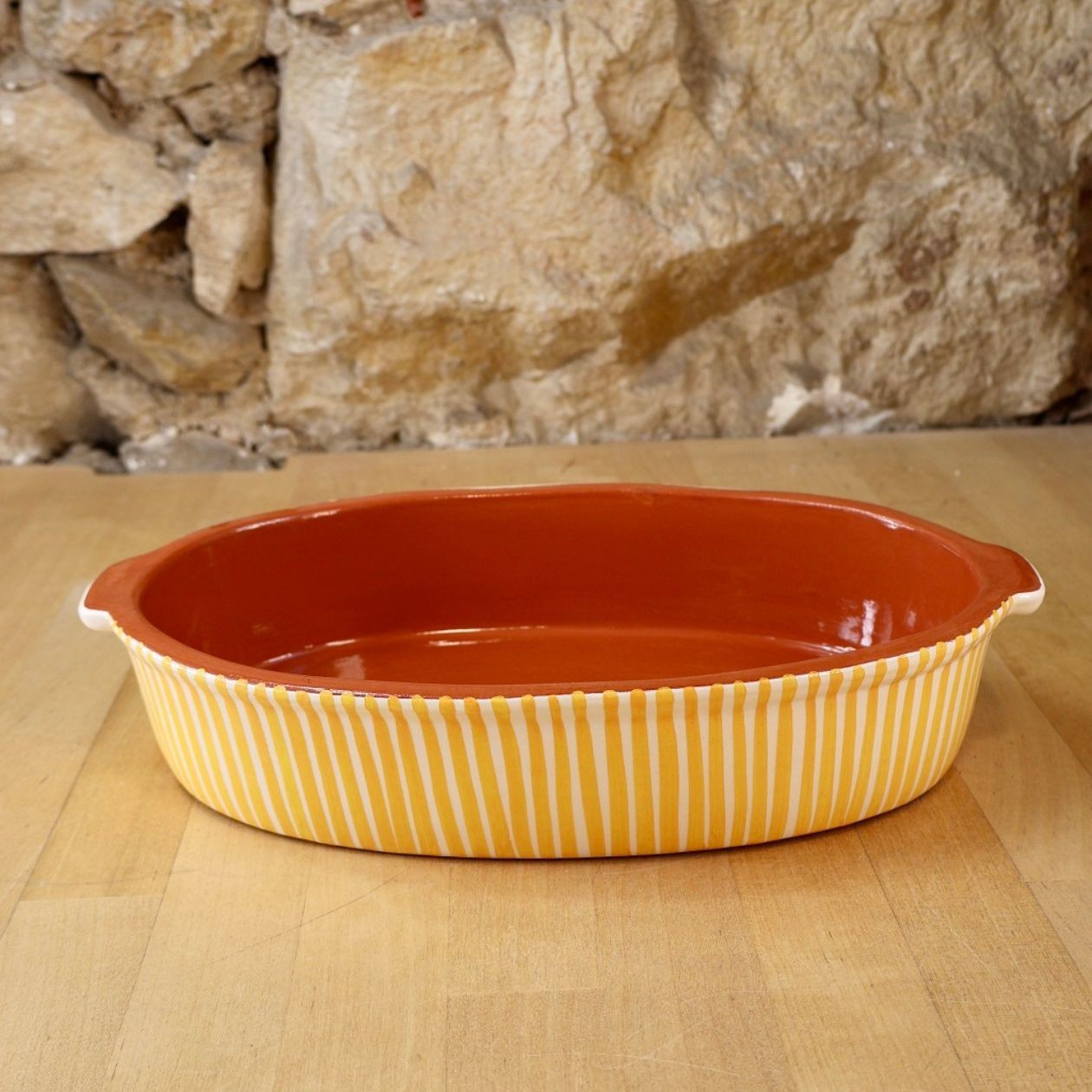 Petit plat oval listas en terre cuite artisanale pour A loja da Cerâmica par Nelia Patalim fabriqué et peint à la main au Portugal par des artisans potiers.