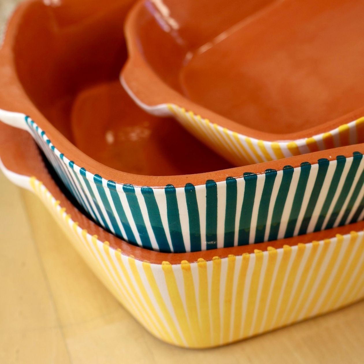 Grand plat carré listas en terre cuite artisanale pour A loja da Cerâmica par Nelia Patalim fabriqué et peint à la main au Portugal par des artisans potiers.