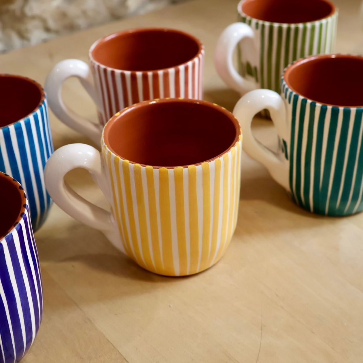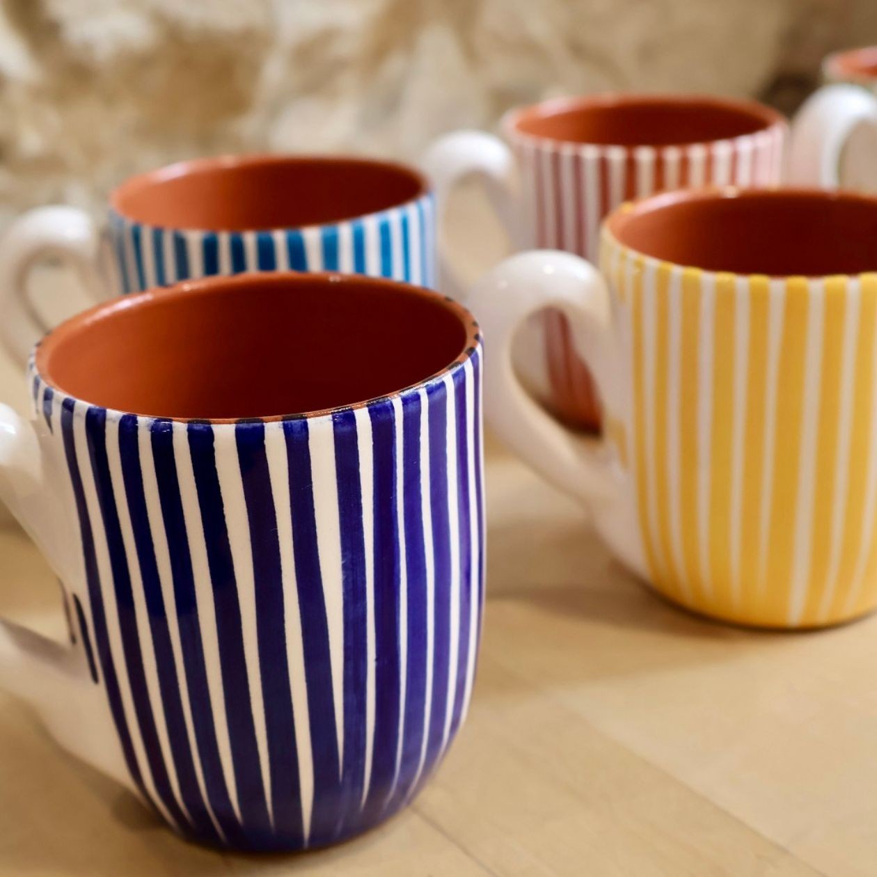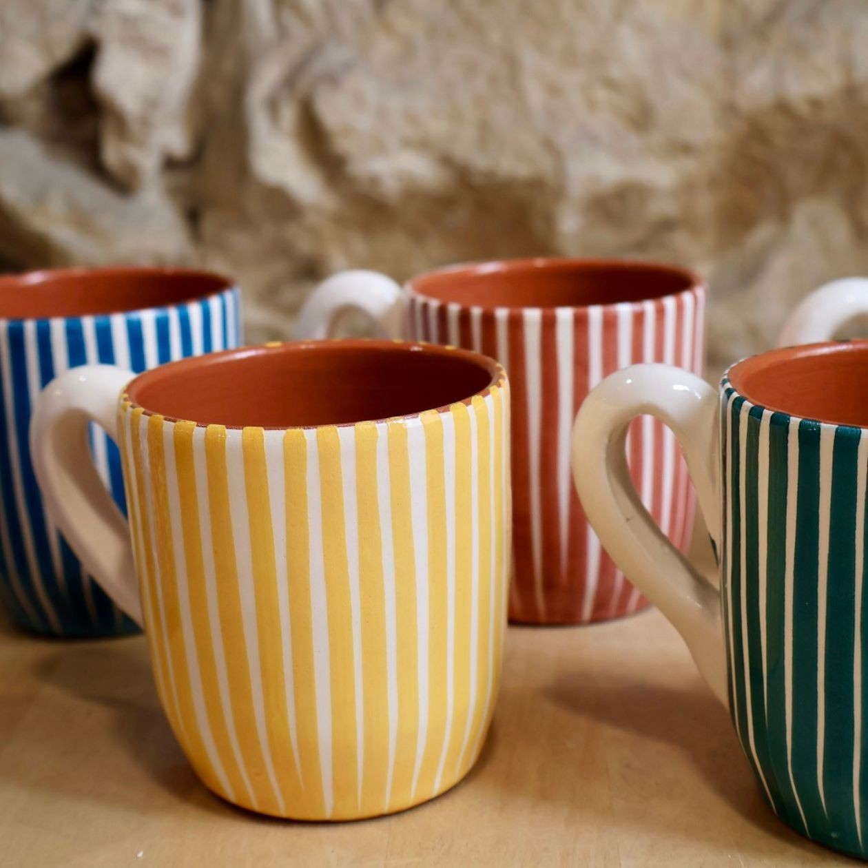 Petit mug arrondi listas en terre cuite artisanale pour A loja da Cerâmica par Nelia Patalim fabriqué et peint à la main au Portugal par des artisans potiers.