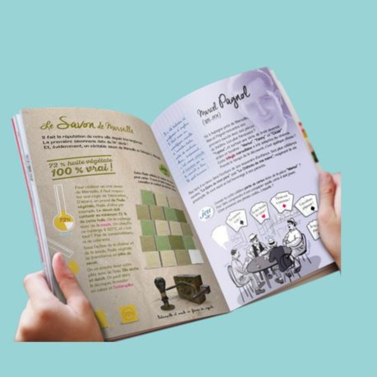 Ici, les collines sont parfumées, la terre est multicolore et le paysage un atelier de peinture. Les villes se transforment en théâtre, les pâtisseries ressemblent à des bateaux et l’on fabrique des santons et du savon. On cultive du riz et l’on récolte du sel, les villages sont dans le ciel et la mer est une merveille. Bienvenue en Provence, bienvenue chez Angèle et Mathis. Pars maintenant avec eux pour des découvertes colorées, amusantes et passionnantes. Bon voyage !