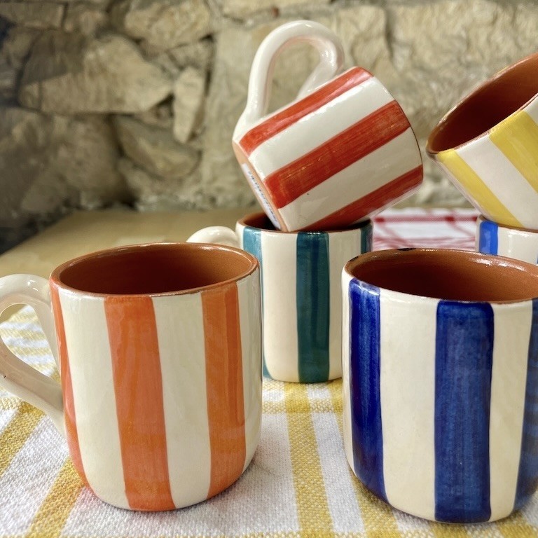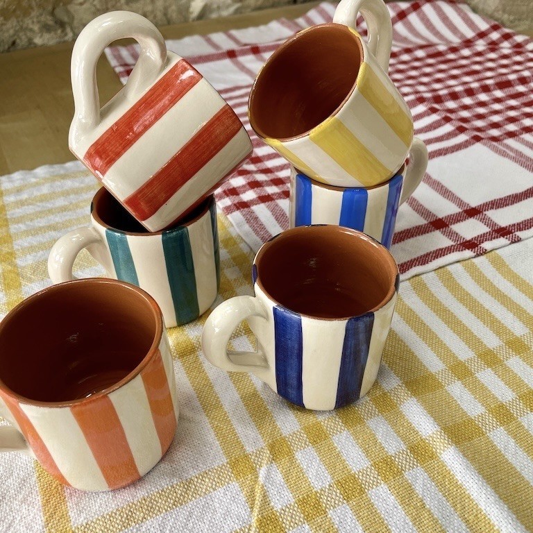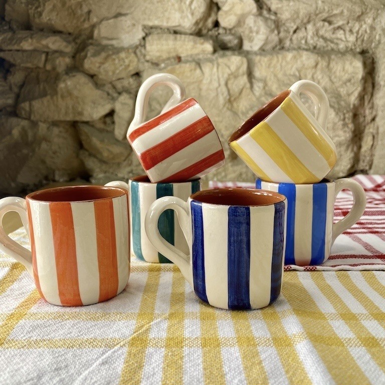 Tasse à café listas larges avec anse en terre cuite artisanale pour A loja da Cerâmica par Nelia Patalim fabriquée et peinte à la main au Portugal par des artisans potiers.