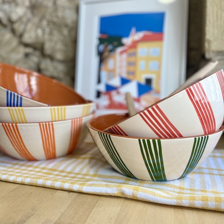 La fabrication des saladiers banda de listas ⌀ 33cm A loja da Cerâmica est artisanale et sont réalisées en petite série.