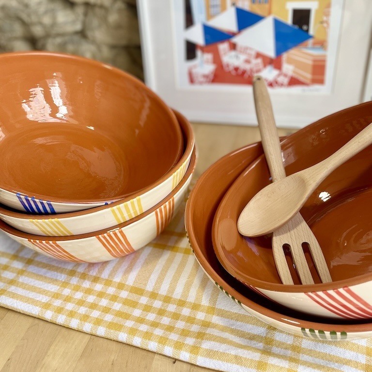 Saladier rond banda de listas ⌀ 33cm en terre cuite artisanale pour A loja da Cerâmica par Nelia Patalim fabriqué et peint à la main au Portugal par des artisans potiers.