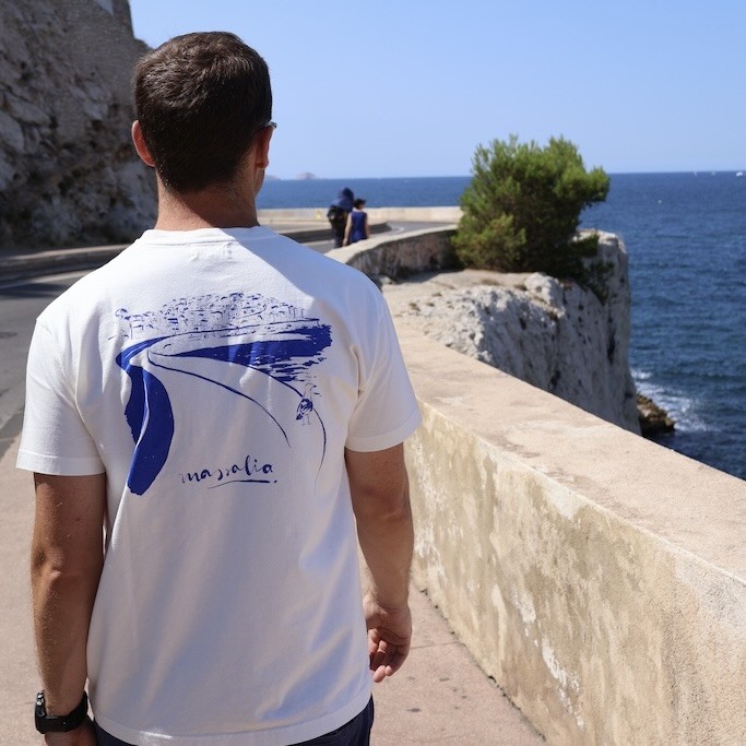 A l'arrière du t-shirt une représentation de la Corniche Kennedy, quartier très représentatif de la vie à Marseille !