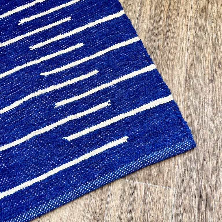 Le tapis Lignes (150 x 100 cm), simple et graphique, est fabriqué avec du coton recyclé au Portugal par des artisans tisserands.