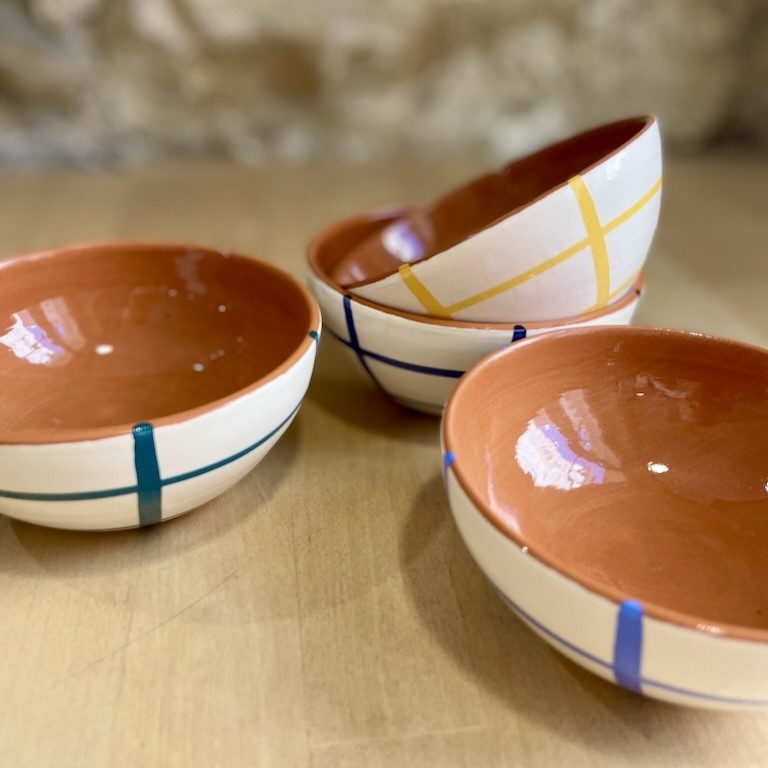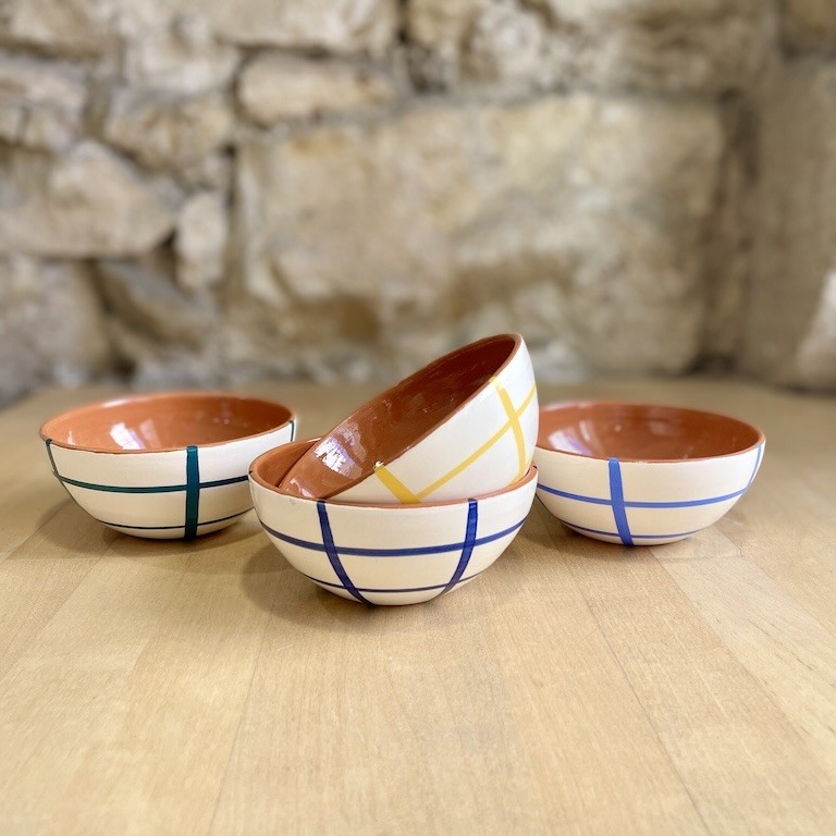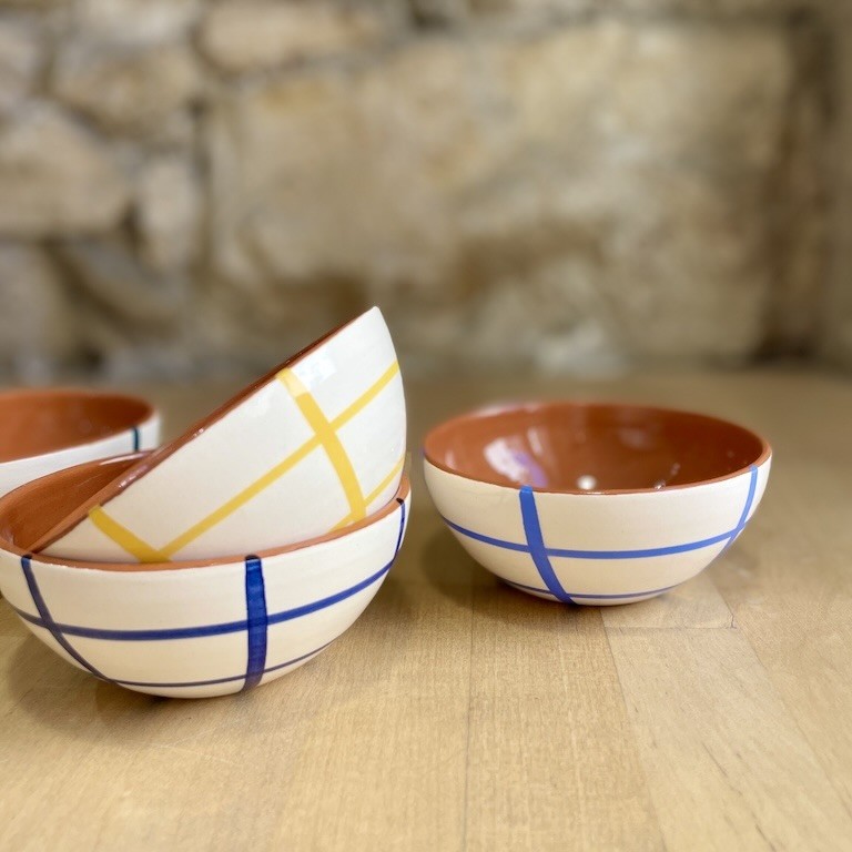 Bol rond quadrillé en terre cuite artisanale pour A loja da Cerâmica par Nelia Patalim fabriqué et peint à la main au Portugal par des artisans potiers.