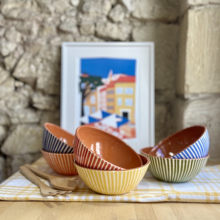 Saladier rond Listas ⌀ 18cm en terre cuite artisanale pour A loja da Cerâmica par Nelia Patalim fabriqué et peint à la main au Portugal par des artisans potiers.