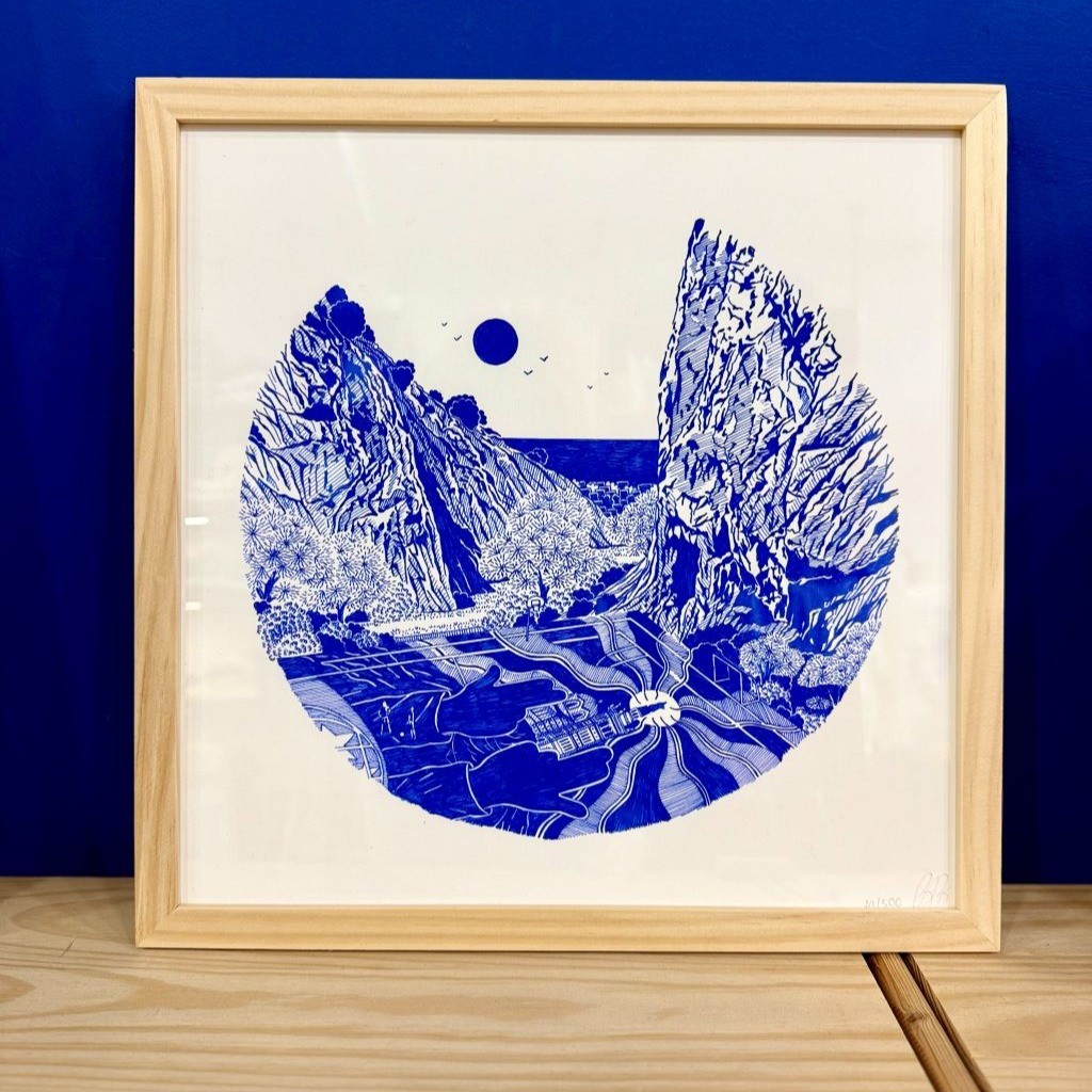 Réalisée au stylo bleu, fidèle à la signature artistique de Bérengère Bouan, cette œuvre mêle précision graphique et sensibilité onirique. Elle s’inscrit dans sa nouvelle collection, une série dédiée aux paysages et lieux symboliques qui façonnent la mémoire marseillaise :